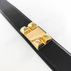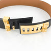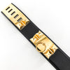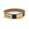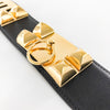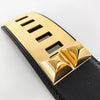 Own a piece of Hermes's Collier de Chien Collection. A black leather waist belt is a wardrobe staple that will enhance any outfit. The beautiful gold-plated studs will give you a sophisticated edge and pair easily with your favorite gold jewelry!