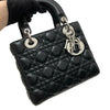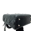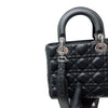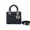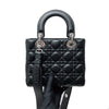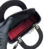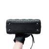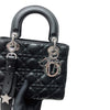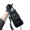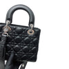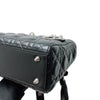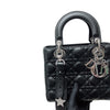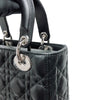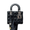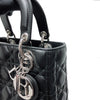 This Dior My Lady Dior Bag is fashioned from geometric quilted patent leather. It has sturdy reinforced leather top handles, with an adjustable and detachable leather shoulder strap, and polished silver hardware, including large links, eyelets, and hanging Dior initials charm.