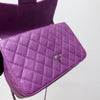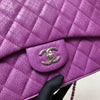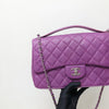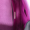 The Elaphe Snakeskin Easy Carry Jumbo Flap Purple is a bold handbag. This classic flap bag is crafted of diamond quilted snakeskin leather in bright purple.  The bag features a leather strap top handle, a silver chain link leather threaded shoulder strap, a rear patch pocket, and a silver Chanel CC Mademoiselle for the facing flap. This opens to a raspberry satin interior ideal for evening essentials and the timeless style of Chanel.