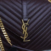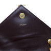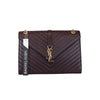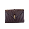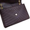 This Saint Laurent Large Envelope bag features a front flap adorned with the brand's signature interlaced YSL initials in Gold-Toned Hardware, a gold chain, and leather strap, and beautiful grained calfskin leather with chevron-quilted stitching. The interior features a zippered pocket perfect for all of your essentials.