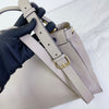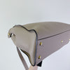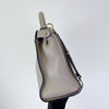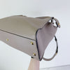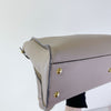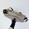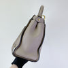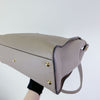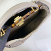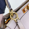 This Medium Fendi Peekaboo features a dove grey leather body, a flat leather handle, an open top with a twist closure, an interior zip closure, and a Tortoiseshell plexiglass bar and eyelet and gold-colour metalware.