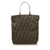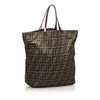 This Fendi Zucca Canvas Tote Bag Brown features a canvas body, flat leather straps, and an open top.
