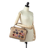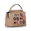 The DotCom satchel features a leather body with flower embellishments, a flat leather top handle, a detachable flat leather strap, a top zip closure, and interior zip pockets.