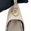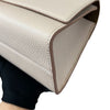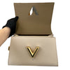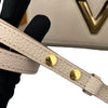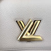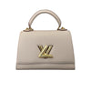 This is an authentic Louis Vuitton Twist One Handle PM Taurillon in Greige. This stylish shoulder bag is crafted of textured leather. The bag boasts a leather top handle, an optional shoulder strap in matching leather, and a polished gold LV twist lock adorning the front-facing flap for a touch of sophistication. This opens to a brown leather interior with patch pockets and a zipper compartment.