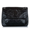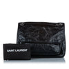 This YSL Niki shoulder bag features a quilted leather body, a curb chain strap, a front flap with a magnetic closure, a front slip pocket, and interior zip and slip pockets.