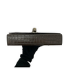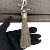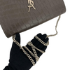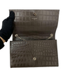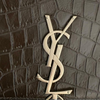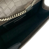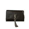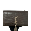 This Classic Monogram Kate Tassel Satchel from Saint Laurent is a stunning piece made from croc embossed calfskin leather in brown. It has a ruthenium chain link crossbody shoulder strap and a flap with a signature YSL logo and magnetic closure. The interior is made of black fabric lining with a patch pocket.