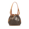 The Louis Vuitton Petit Noe features a monogram canvas body, an adjustable flat leather strap, and a top drawstring closure.