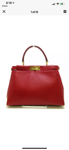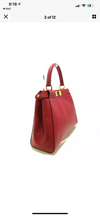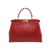 This Medium Fendi Peekaboo features a leather body, a flat leather handle, an open top with a twist closure, and an interior zip closure.
