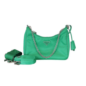 This Prada Re-Edition 2005 in a standout green, is a statement that seamlessly combines style and functionality. Its zipped top closure ensures the safety of your belongings while the fabric lining adds a touch of beauty to the interior. The...