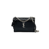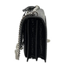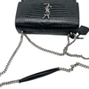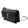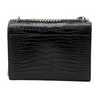 This is an authentic Saint Laurent Calfskin Crocodile Embossed Medium Monogram Sunset in Black. This stylish shoulder bag is crafted of crocodile-embossed calfskin leather in glossy black. The handbag is equipped with a rear patch pocket, reinforced by gusseted side panels, and adorned with a silver chain link shoulder strap featuring a leather shoulder pad. On the crossover flap, a corresponding silver YSL logo adds to its elegant appeal. The bag conveniently opens through a magnetic snap, revealing a partitioned interior crafted from black suede leather and complemented by a patch pocket.