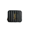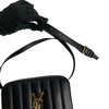 The Saint Laurent belt bag features a raised signature YSL gold plaque on a quilted square leather quilted body and a thin belt strap. The interior is large enough to fit a normal iPhone 10 but not the max-sized iPhone.