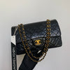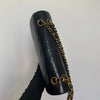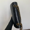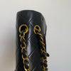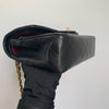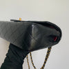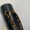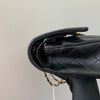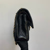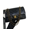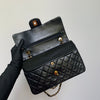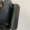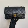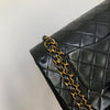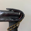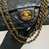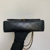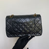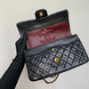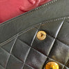 This gorgeous Chanel Vintage Double Flap Bag in Quilted Lambskin Black leather in size medium, features a woven strap, an exterior back slip pocket and gold-tone hardware. Its double flap and frontal 24k coated gold CC turn-lock closure opens to a red leather interior. Perfect for an owner who appreciates a vintage leather piece.