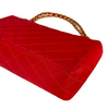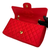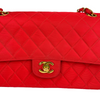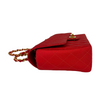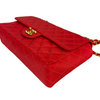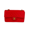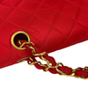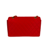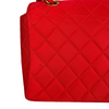 This Medium Sized Chanel single flap bag is made from diamond quilted nylon material in red and features 24k coated gold chain-link nyon-threaded shoulder straps and a front flap with a gold classic CC turn lock. The bag opens to a matching leather interior with a patch pocket for stylish organized storage.